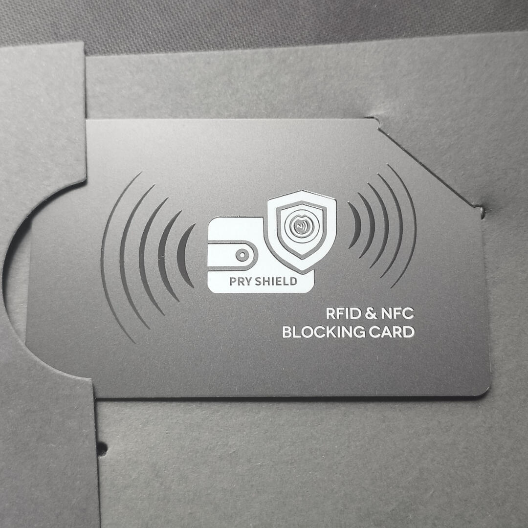 The Pry Shield RFID & NFC blocking card is a simple card that you keep in your wallet, your pocket, or your purse, to protect your cards from data thieves, who can skim or steal data from your cards (or charge money to them) within seconds without you even noticing.