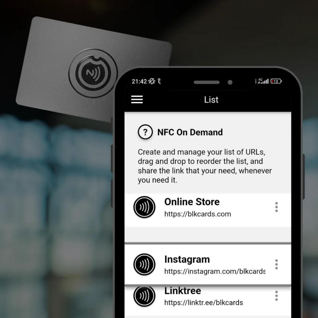 Install our free mobile App "BLK CARDS" available on all App stores for iOS & AndroidA simple and intuitive App to record in 5 seconds any URLs directly to any NFC cards or NFC tags (compatible with all the most popular NFC chips NXP ntag213, ntag215, ntag216 and more).The URL will then instantly open on any NFC-enabled smartphones, in just one tap. No need to add people to your contacts, no more hassle spelling names, social media usernames, phone numbers, or email addresses.